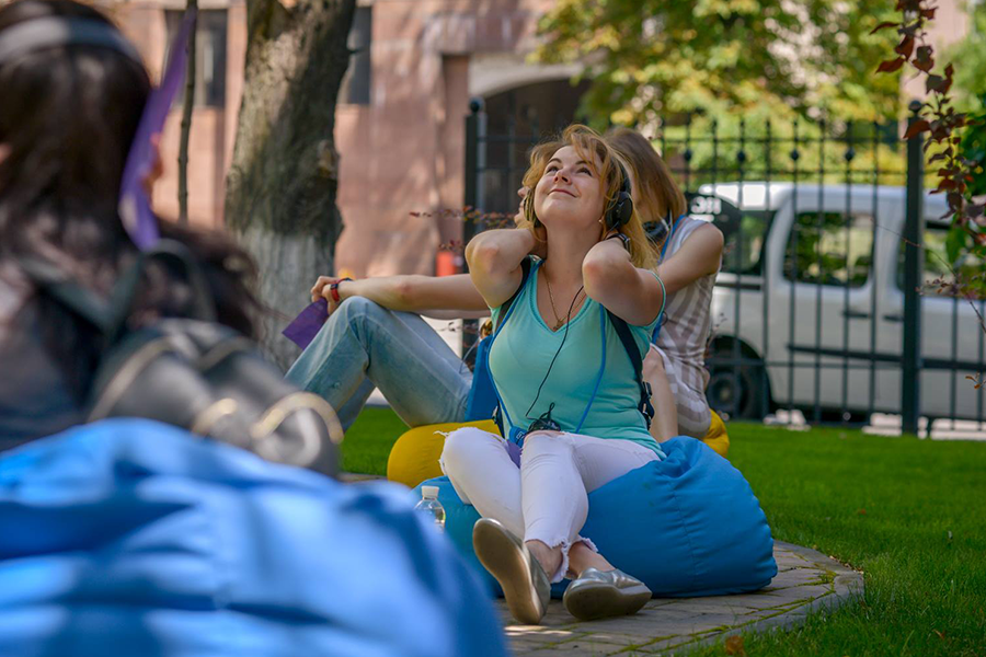 Место нашей встречи — Парковый мост на Подоле. Среди публики в основном молодежь. Нам раздают наушники и набор странных предметов: бумага, карандаш, зеркало, проездной на метро – и отправляют к середине моста ждать администратора. Вскоре она появляется и проводит краткий инструктаж и просит следовать голосу в наушниках. Спектакль начинается.