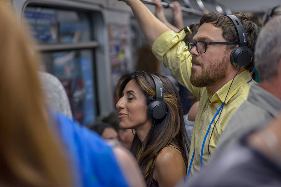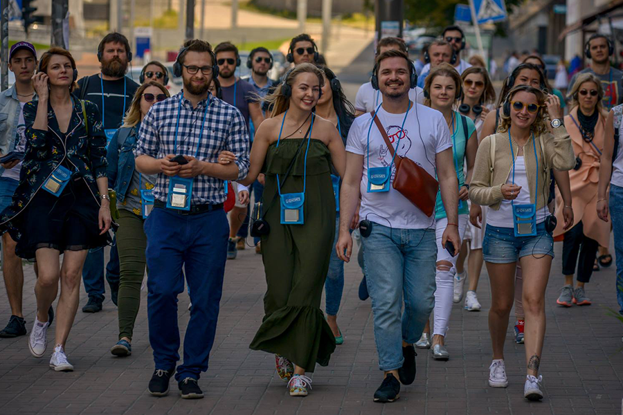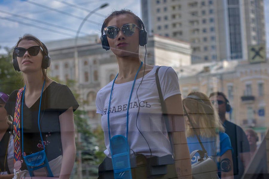 Люди с интересом разглядывают группу и принимают то ли за иностранцев, использующих аудиогид, то ли за участников флешмоба. Пожилая женщина, завидев нас, начинает креститься и спрашивать, что происходит, но ее не слышат из-за наушников.