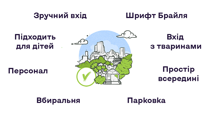 В додатку є багато параметрів, за якими можна відфільтрувати локації: вхід, вбиральня, зручність всередині, ввічливість персоналу, парковка і велопарковка, чи підходить заклад для дітей, наявність продубльованого меню шрифтом Брайля або адаптованого меню на сайті, можливість відвідати заклад з тваринами, наявність ігрової кімнати і сповивального столика тощо.