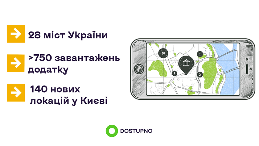Громадська організація Доступно.UA подарувала Києву до дня міста карту доступності столичних локацій. Команда перевірила 150 закладів Києва, серед яких є адміністративні локації, заклади громадського харчування, супермаркети, аптеки, банки, торгові центри тощо. Тепер усі локації можна знайти на мапі доступності українських міст, що розвиває організація: всього тут присутні 28 міст України і понад 1140 закладів.