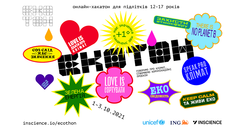 Дитячий фонд ООН в Україні та INSCIENCE проведуть всеукраїнський онлайн-хакатон «ЕКОТОН» для підлітків, що присвячений змінам клімату та захисту довкілля. Підлітки у віці 12–17 років зможуть більше дізнатися про кліматичний активізм, отримати підтримку експертів та гранти на реалізацію своїх ініціатив у школах та громадах.