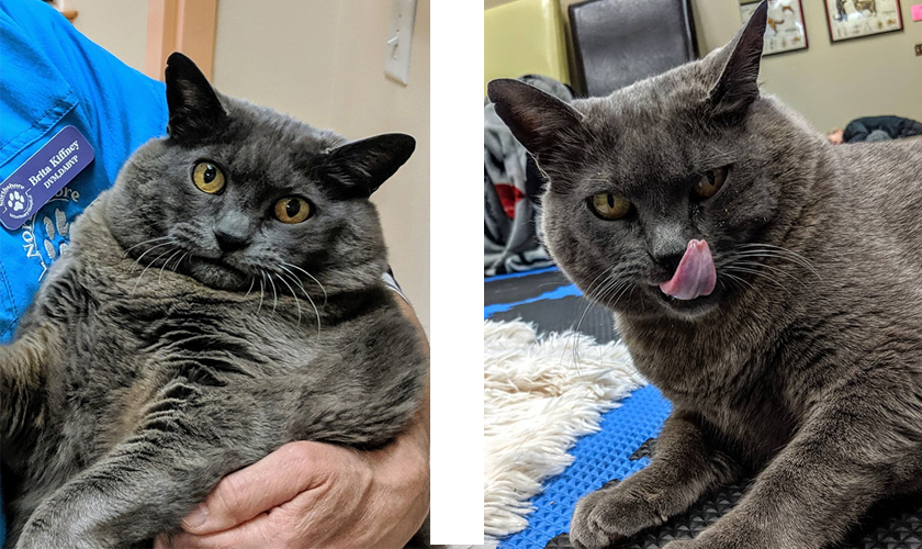 Кішка виконує спеціальні вправи, в тому числі ходить по підводній біговій доріжці, оскільки страждає від артриту та має 5 кілограмів зайвої ваги. Вода забезпечує збільшення функціонального використання кінцівок без надмірного навантаження на суглоби. Спостерігати за прогресом кицьки можна у Instagram та на YouTube.