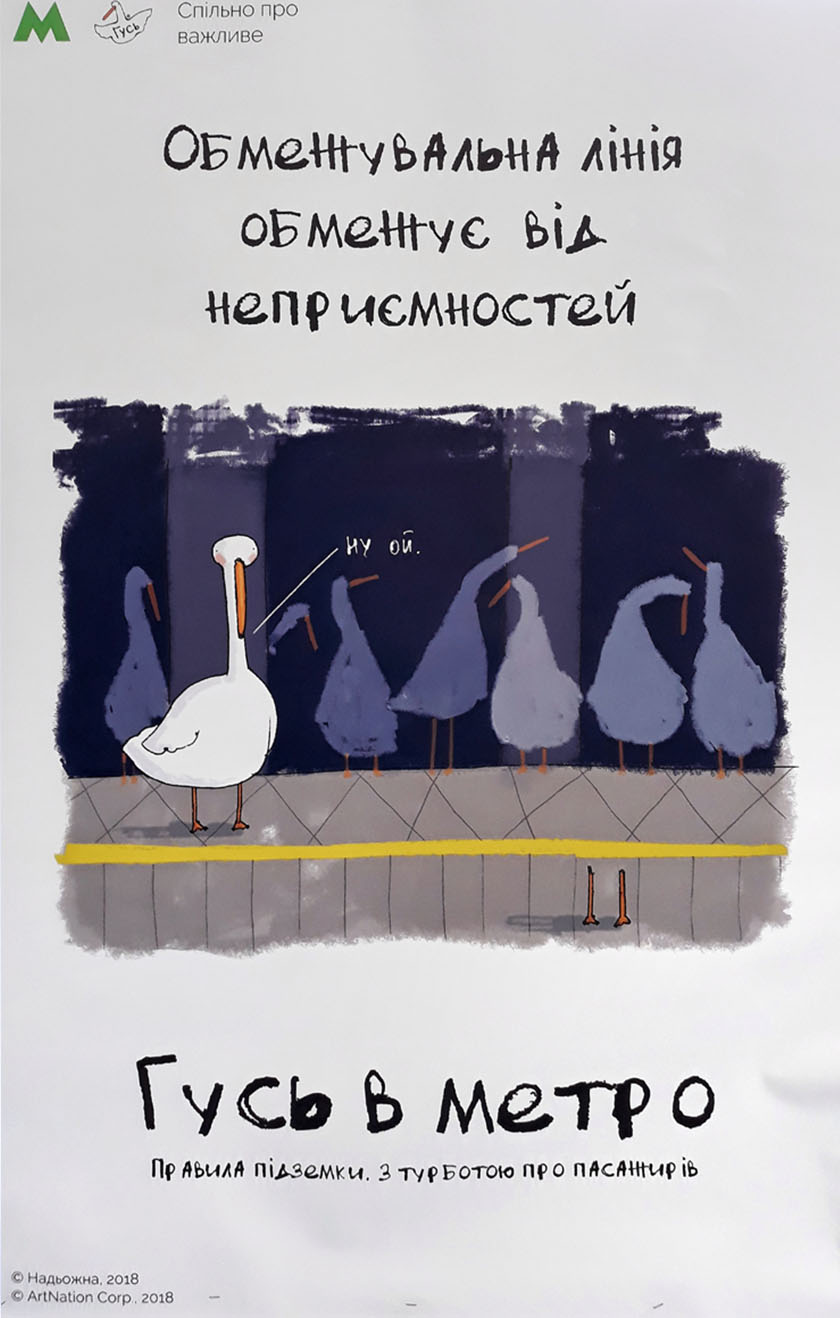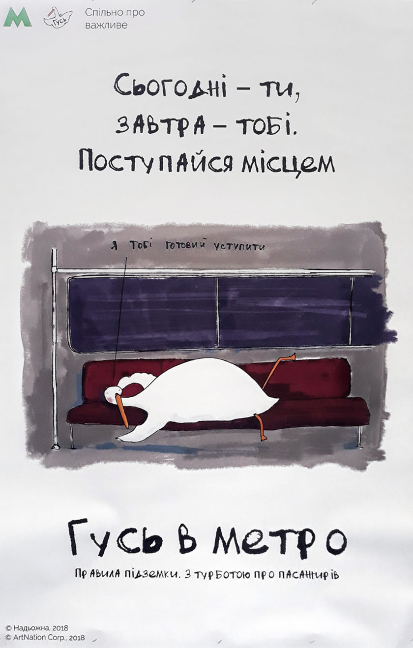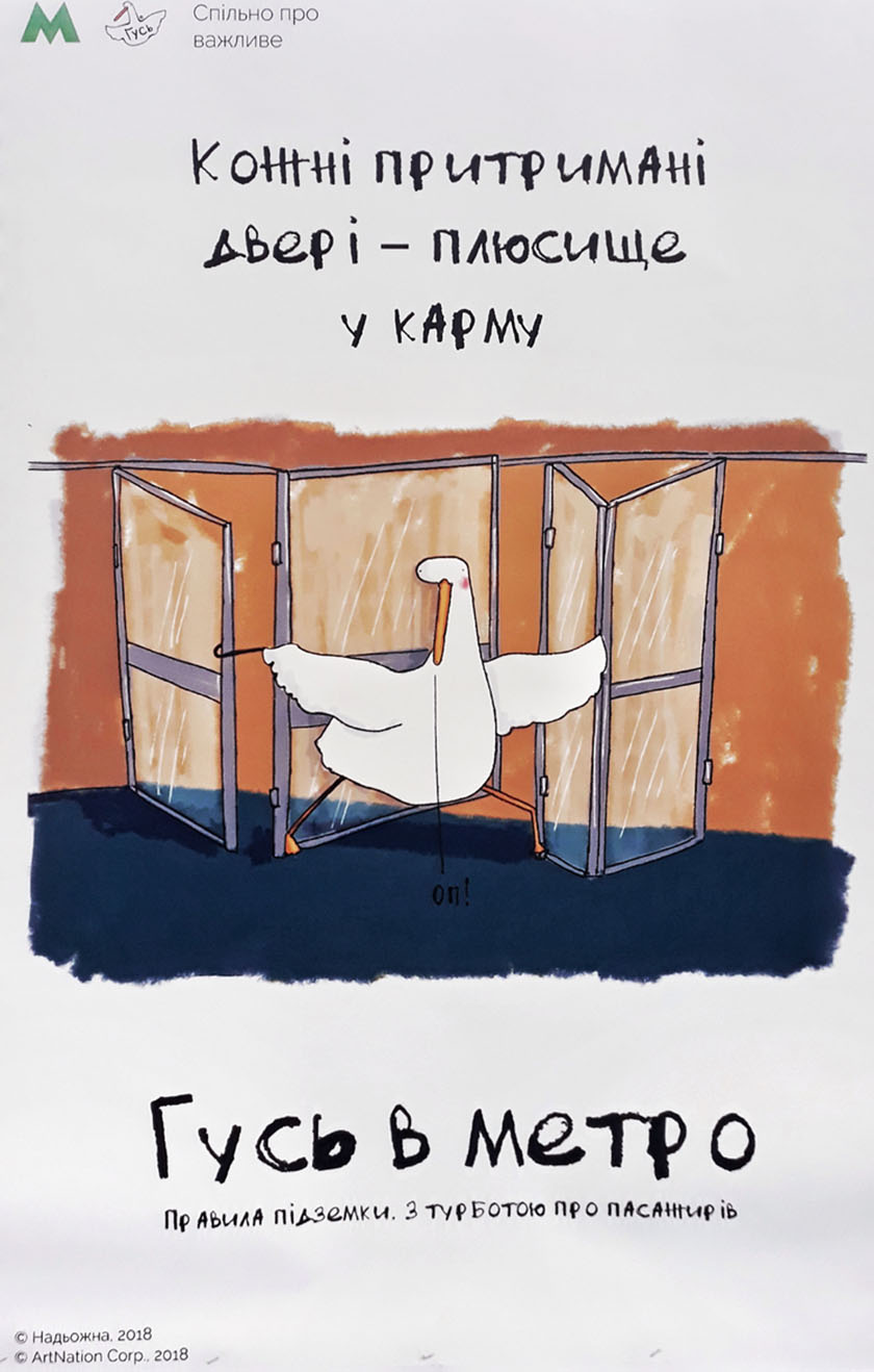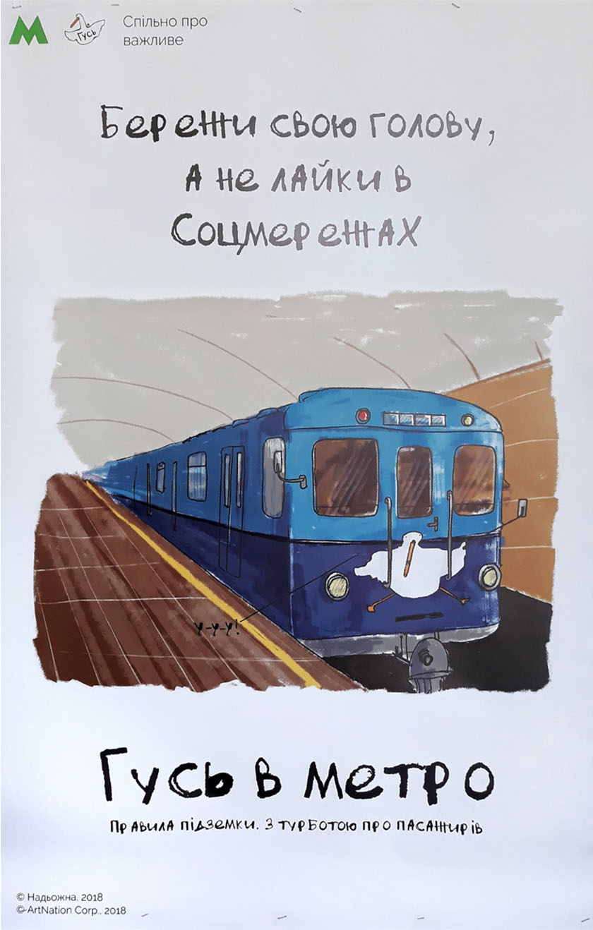 Найпопулярніший вітчизняний фейсбук-персонаж Гусь на постерах у столичному метро буде давати поради щодо поведінки у підземці, закликати до ввічливості та, звісно, жартувати.