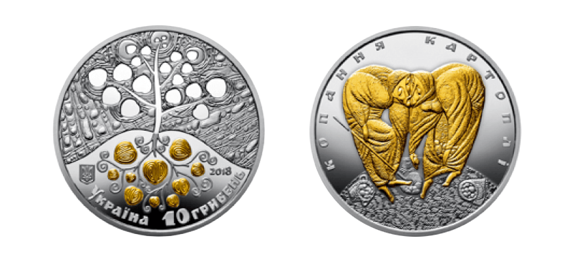 Вже з 22 травня цього року буде випущено тираж у чотири тисячі срібних монет «Копання картоплі». На аверсі зображено своєрідне дерево життя з дзеркальним верхів’ям, а нижні бульби будуть золоті. Також унизу розміщено малий Державний герб України, рік карбування монети та написи «Україна» й «10 гривень». На реверсі монети – дзеркальне зображення чоловіка та жінки, які копають картоплю, а їхні постаті утворюють серце. Напис, який розміщено тут – «Копання картоплі».