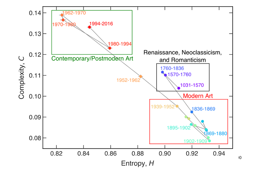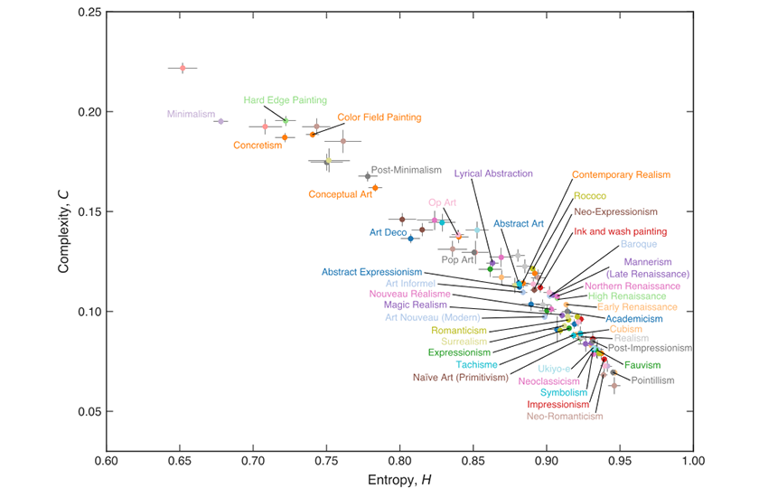 Міжнародна команда науковців з Бразилії, Словенії та Австрії під керівництвом Арольдо Рібейро з Державного університету Маринга вивчили близько 140 тис. робіт різних стилів, століть і художників із бази даних WikiArt. Вони розрахували для кожної складність і ентропію, щоб подивитися, як ці два параметри змінювалися з часом.