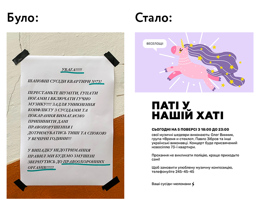 «Ціль проекту – підштовхнути людей до більш цивілізованої та ефективної комунікації. Адже звичну людську мову в оголошенні від ЖЕКу жителі будинку сприймуть більш дружньо, ніж канцелярит, – пояснюють розробники. – Здоровий гумор у повідомленні про домашню вечірку має шанс розтопити серце сусідів так, що вони пробачать вам караоке під Винника о 12-й ночі. Повідомлення про загублену кішку з її великим фото точно збільшить шанси відшукати цю гуляку. А, головне – такими оголошеннями не соромно поділитись у соцмережах чи надіслати в группу вашого ОСББ у Viber».