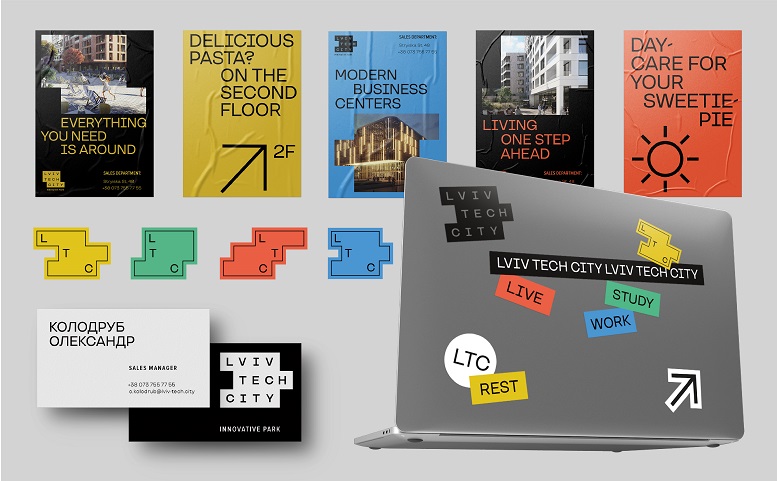 Компанія розробила логотип, стилістику, підібрали шрифти та кольори. Основою логотипу став квадрат, що поділений на три рухомих блоки. Він символізує стабільність та одночасний рух, розвиток. Використовуючи асоціації, креативники підібрали 4 кольори, що диференціюють кожний блок. Так, блакитний позначає бізнес зону, помаранчевий — житлову, зелений — зону для навчання, а жовтий — для відпочинку.