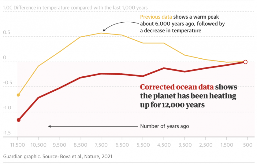 Раніше вважалося, що пік потепління настав шість тисяч років тому, а потім температура впала, доки індустріалізація не призвела до збільшення викидів вуглецю, що викликало парниковий ефект. Ці дані були отримані на основі аналізу викопних раковин. Але виявилося, що вони відображали лише температуру більш спекотного літа і не брали до уваги холодніші зими. Саме тому кліматичні моделі були побудовані неправильно.