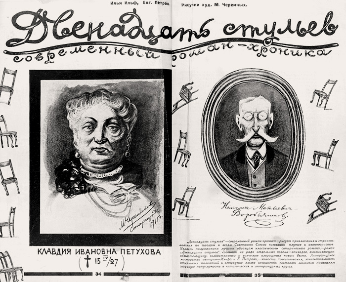 «Дванадцять стільців», художник Михайло Черемних, розворот першого журнального видання, 1928 рік