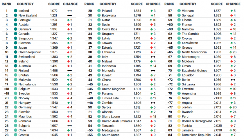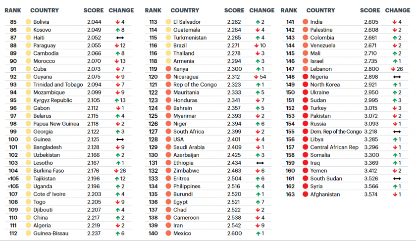 «Україна продемонструвала найбільше поліпшення у світі за підсумками минулого року і піднялася на дві позиції, з 152 до 150. На це вплинули зменшення кількості смертей в результаті внутрішнього конфлікту на 85,7%, або 7,8 тис. загиблих. Проте показники інтенсивності конфліктів внутрішнього та з сусідніми країнами залишаються найвищими. Значне поліпшення безпеки включило скорочення кількості переселенців, випадків позбавлення волі, впливу тероризму і політичного терору», – йдеться в дослідженні.