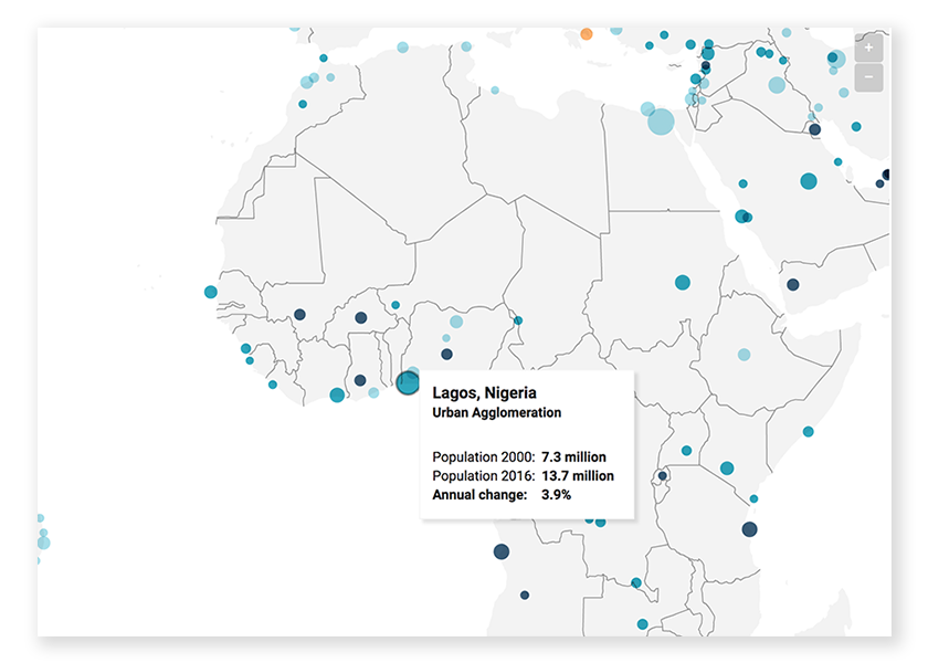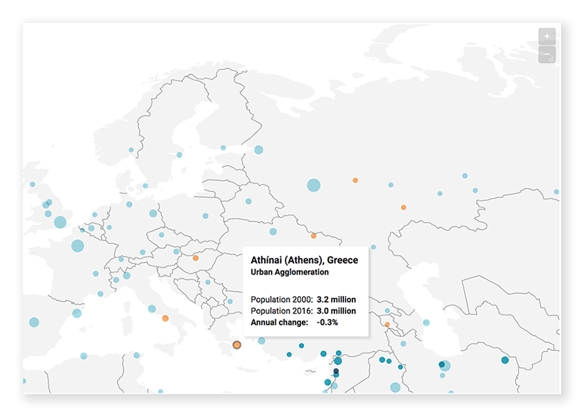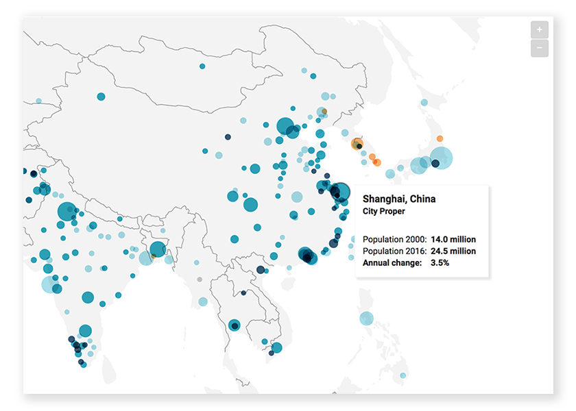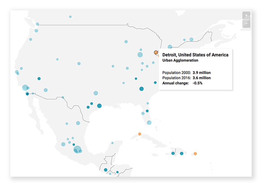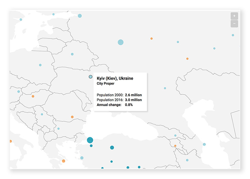 На карту потрапили 500 міст, населення яких у 2016-му році перевищувало мільйон. Вони позначені колами, які розрізняються за двома параметрами – розмір кола пов’язаний з чисельністю населення, а колір демонструє зростання або відтік жителів з 2000 по 2016 рік. Наприклад, «зростаючі» міста позначені блакитним (чим темніше, тим швидше збільшується чисельність населення), помаранчевий колір говорить про скорочення числа жителів.