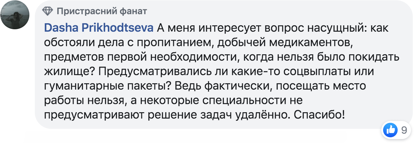 – Як було з їжею, медикаментами, предметами першої необхідності, коли не можна було покидати житло? Передбачалися якісь соцвиплати або гуманітарні пакети? Адже фактично відвідувати місце роботи не можна, а деякі спеціальності не передбачають рішення задач віддалено. Дякую!