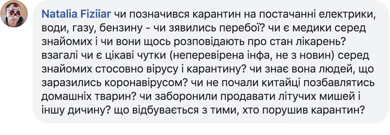 – Взагалі чи є цікаві чутки (неперевірена інфа, не з новин) серед знайомих стосовно вірусу і карантину?