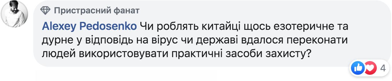 – Чесно кажучи, не бачу, щоб на цьому якось загострювали увагу. Навмисне або ні, китайці наразі замислюються не над тим, хто винен, а над тим, що з цим робити. У своїй більшості, вони досить патріотично налаштоване суспільство. Волонтерський рух та благодійні пожертви набули справді масового характеру під час епідемії: у соцмережах поширювали хештег #武汉加油 (#Ухань, ми з тобою!), а більшість моїх знайомих та друзів змінили аватарки на свої фото у захисній масці. І хоча, можливо, все це здається дрібницями на фоні масштабу проблеми, але ці дрібниці формують соціальну свідомість і згуртовують населення.