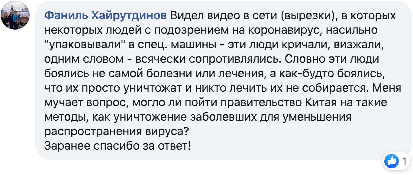 – Бачив в мережі відео, де людей з підозрою на коронавірус насильно «упаковували» в спецмашини – ці люди кричали й всіляко чинили опір. Немов боялися не самої хвороби або лікування, а що їх просто знищать і ніхто лікувати їх не збирається. Мене мучить питання, чи міг уряд Китаю піти на такі методи, як знищення хворих для зменшення поширення вірусу? Дякую за відповідь!