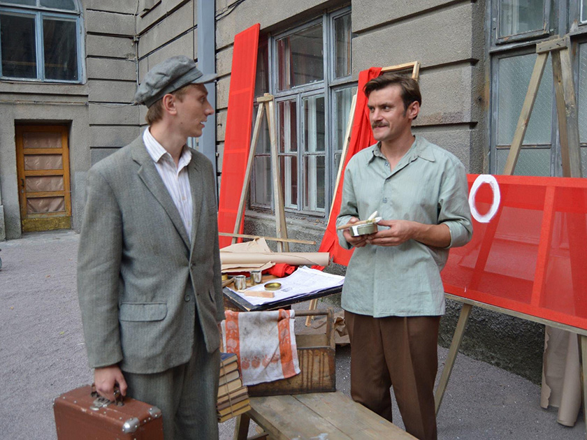 Акторський склад, як бачите, солідний. Режисер Тарас Томенко разом зі сценаристкою Любою Якимчук хотіли підібрати максимально схожих персонажів. З завданням з пошуку акторів і запрошенням на проби чудово впоралася кастинг-директорка Наталія Наталушко. Власне, я теж пробувався на художника Анатоля Петрицького, з яким у мене знайшли схожі риси, але його вирізали зі сценарію. Актори, з якими я співпрацював на майданчику, круті професіонали, хороші люди та надійні партнери без зірки на лобі. І абсолютно нормально і по-дружньому ставилися до менш досвідчених колег. І на майданчику спілкуватися з усіма було тільки в задоволення. У нас було чотири дні, коли ми знімали двір будинку Слово. І там було достатньо багато підготовчої роботи й ще якісь нюанси, та інколи ми просто в перервах між сценами грали разом у волейбол на цьому майданчику. Такі спільні моменти створювали дуже дружню атмосферу.