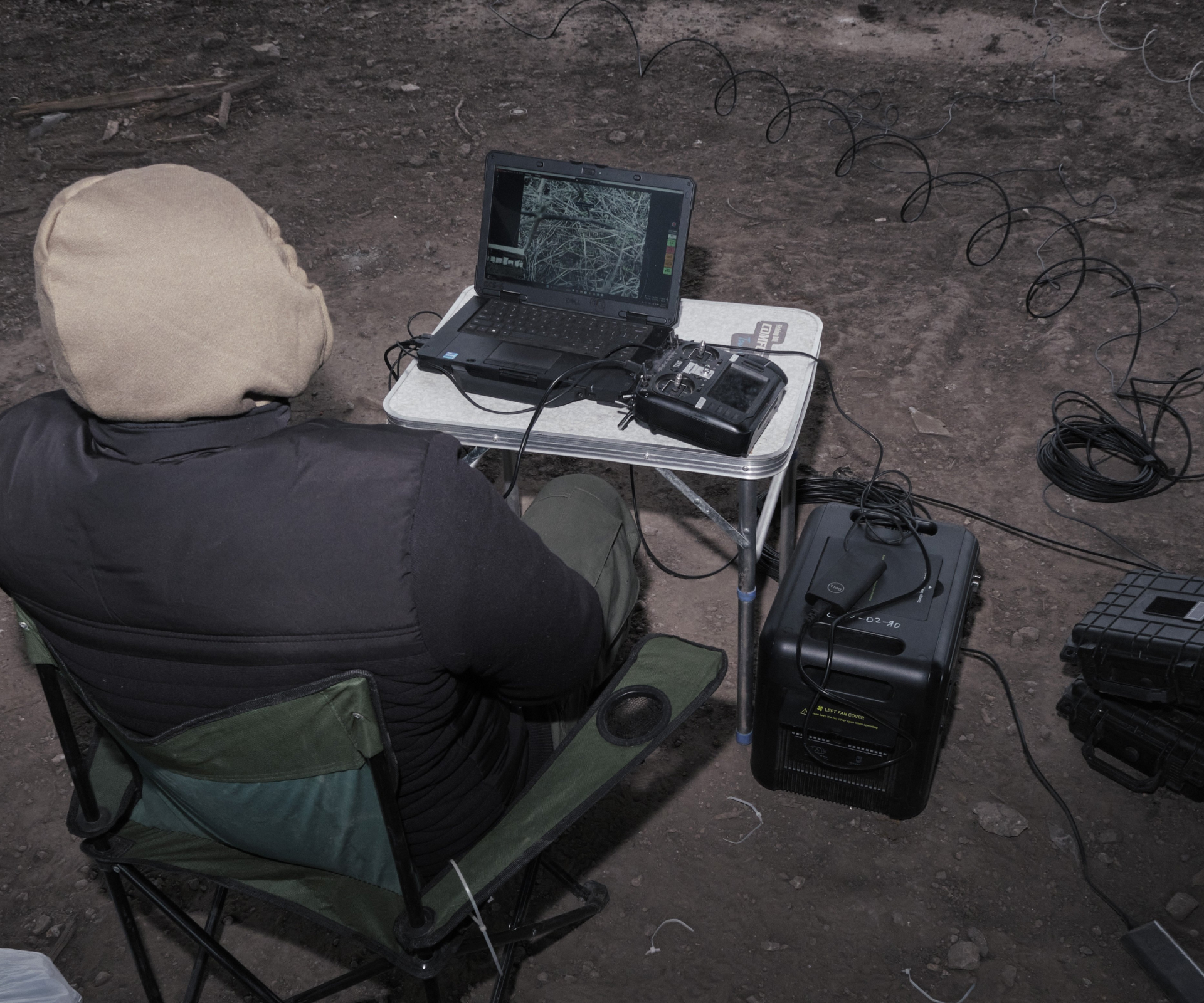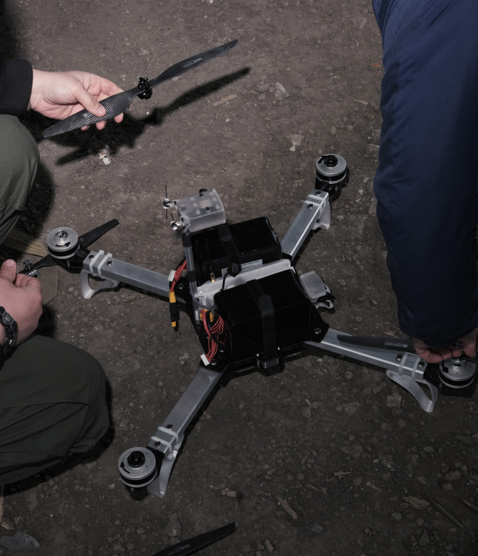 Ми на Харківщині в полях посеред нічого. Під невеличким навісом на землі — з десяток різноманітних дронів. З кількох ящиків створене імпровізоване робоче місце, де перед монітором по черзі сидять бійці. На екрані — теж імпровізоване робоче місце, де перед монітором по черзі сидять бійці, тільки вид зверху, з дрона, який неприємно дзижчить десь у небі. Боєць відлітає трохи вбік, цілиться в невеличку білу мішень на землі й скидає муляж боєприпасу. За кілька секунд ми з землі бачимо, як він падає в парі десятків сантиметрів від цілі.