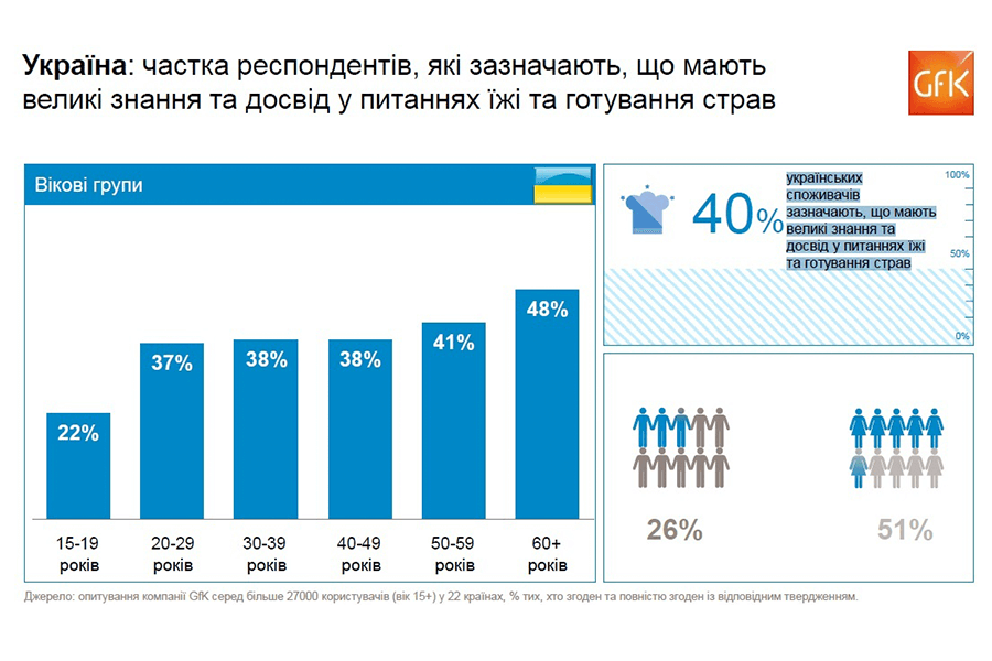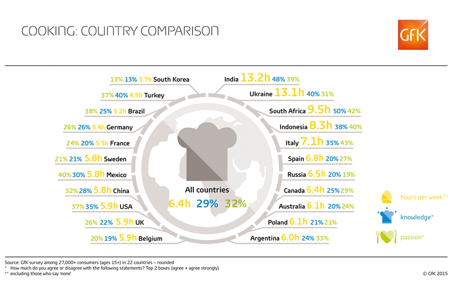 Данные опроса демонстрируют – чем старше респондент, тем больше времени он проводит на кухне. Меньше всего готовят украинцы в возрасте от 15 до 19 лет – в среднем 8,8 часов еженедельно, но и этот показатель выше результата многих других стран. В том числе и соседних – жители России тратят на готовку 6,5 часов. Для сравнения, в Южной Африке этот показатель равен 9,5 еженедельным часам, в Италии – 7,1, в Австралии – 6,1, в США – 5,9, во Франции – 5,5, в Турции – 4,9, в Южной Корее – 3,7 часов в неделю.