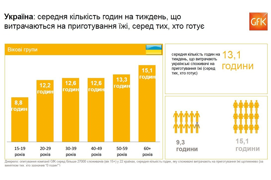 Результаты нашумевшего международного исследования компании GFK показали, что украинцы вместе с индусами тратят на приготовление еды времени больше всех в мире. В среднем мы «убиваем» на это занятие 13 часов жизни в неделю. Причем женщины проводят на кухне существенно больше времени, чем мужчины – 15,1 против 9,3 еженедельных часов.