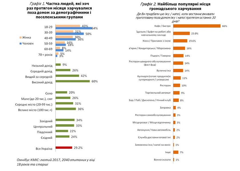 Приверженность украинцев традиционному домашнему питанию подтверждают результаты опроса Киевского международного института социологии (КМИС), проведенного в феврале 2017 года, – только 29,3% ели за пределами семейного очага за последний месяц. При этом мужчины питаются вне дома в 1,5 раза чаще женщин.