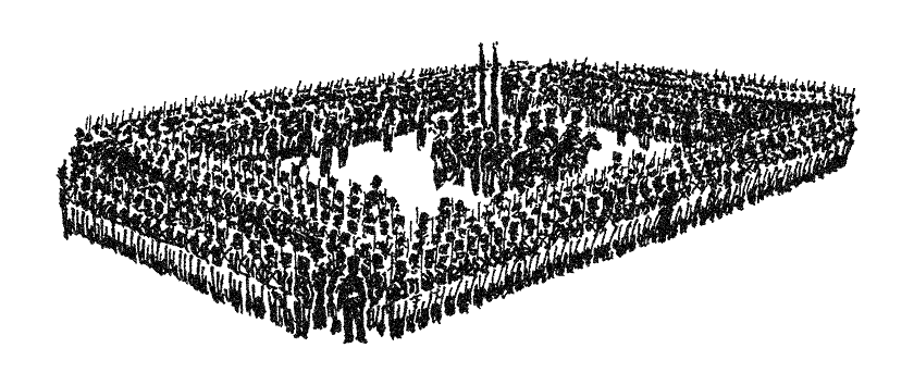 Каре – это способ построения войск в битве, представляющий собой квадрат с пространством внутри. Вообще-то таким промышляли еще римляне, но по-настоящему распространенным каре стало в XVII–XIX веках. Дело в том, что на определенном этапе развития военного искусства мобильная и быстрая кавалерия рубала всех в капусту. В качестве противодействия и появились эти сплоченные и дисциплинированные квадраты из солдат. По сути, это были движущиеся редуты, которые беспрерывно палили во все стороны из огнестрельного оружия, а если уж кто-то и мог прорваться внутрь, то там его встречал саблями резерв.