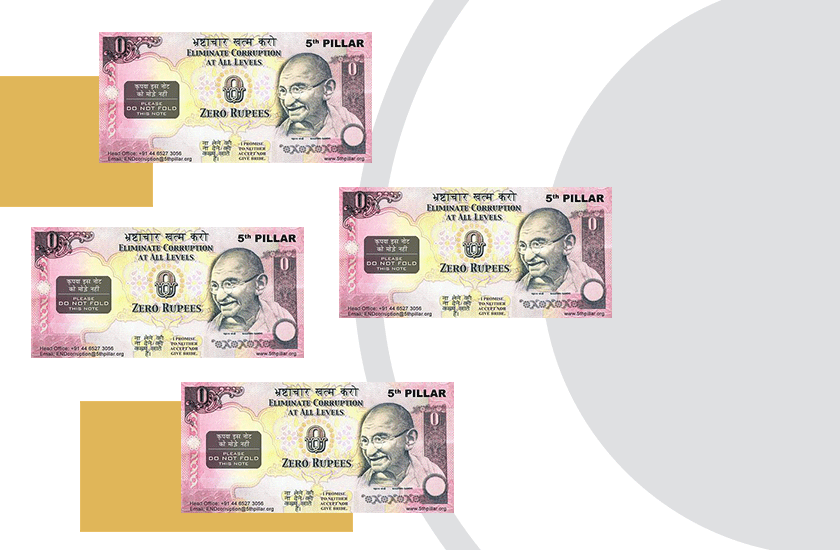 Як і в Україні, прискорення або просто виконання багатьох бюрократичних процедур у багатьох країнах вимагає «прихованої плати». 2007 року індійські активісти надрукували й розповсюдили 25 тисяч «нульових рупій» – підробних банкнот із закликами не давати й не брати хабарі – спеціально для користування в держзакладах. Цей іронічний спосіб боротися з корупцією виявився ще й украй дієвим. За десять років активісти видали більше мільйона таких купюр.