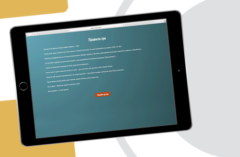 Схожу онлайн-гру «Обираєш ти!» нещодавно випустили і в Україні. У ній можна грати за президента, прем’єра або депутатку і стежити, як рішення, пов’язані в тому числі з хабарництвом, впливають на рейтинг гравця. До речі, до персонажів обіцяють скоро додати голову ОДА.