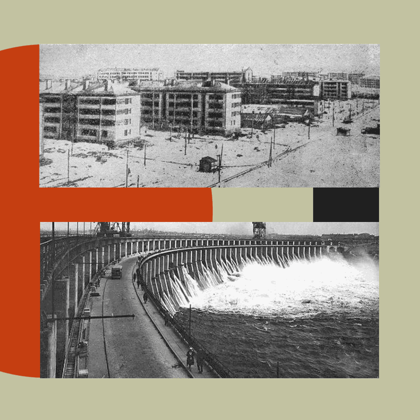 Ще одним витвором архітектурного й інженерного мистецтва є ДніпрогГЕС, яка була побудована в 1930-1932 роках. Гідроелектростанція стала монументом інженерії і нової влади. У зведенні цього об’єкта брав участь архітектор Веснін, який навчався у ВХУТЕМАСі та був апологетом конструктивізму, інженер Александров та американський воєнний інженер Г’ю Купер.