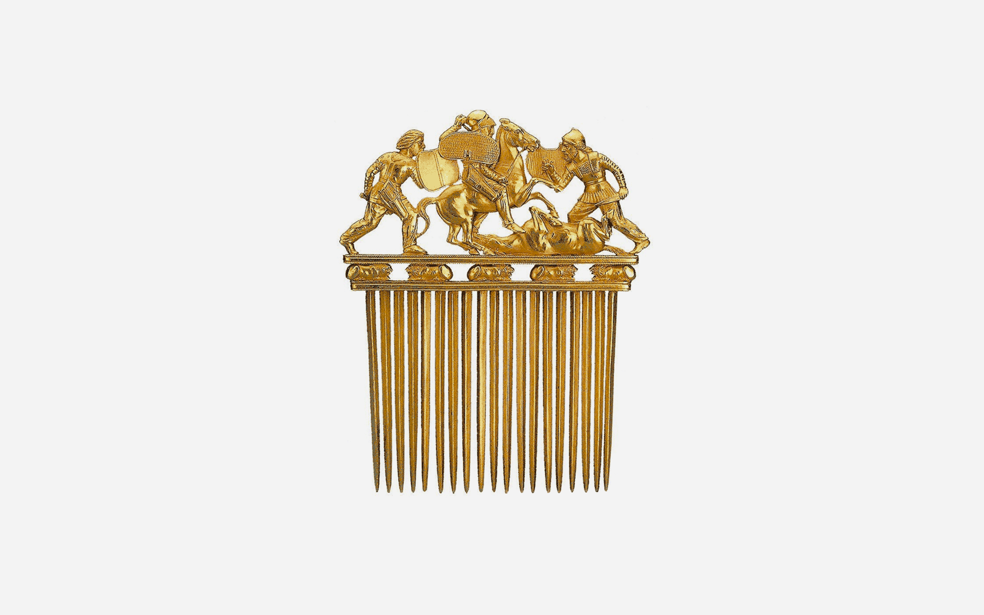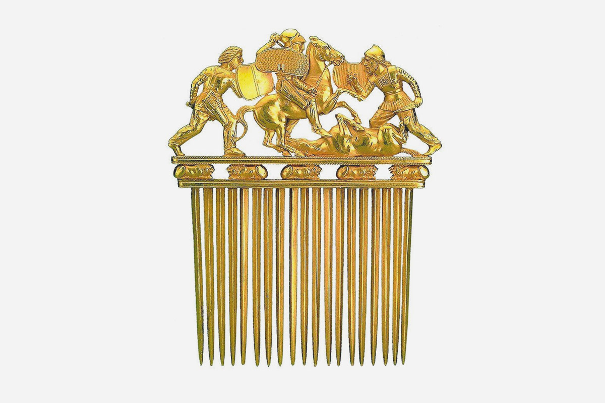 Серед них і знаменитий скіфський гребінь з чистого золота. У 1912-1913 роках на території сучасної Запорізької області розкопали величний курган Солоха. Біля узголів’я, ймовірно, скіфського царя, що правив близько 2,5 тис. років тому, лежав золотий гребінь, прикрашений сценою битви.