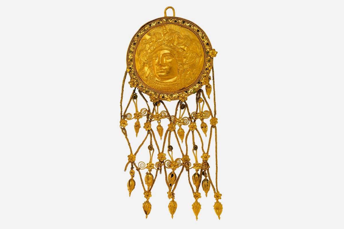 На голові правителя лежала золота діадема, на руках — золоті браслети, на шиї — золотий диск вагою 461 грам. Не відставала і дружина давнього царя з асортиментом свого золота і парними підвісками з портретом Афіни. Там же згодом знайшли (і переправили в Ермітаж) й знамениту золоту бляху на щит у формі оленя.