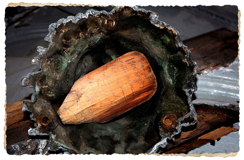 Спеціалісти розпочали роботу, та у середині лютого 2018-го прислали директорці музею Юлії Литвинець фотографію: під бронзовою накладкою з мордою лева вони знайшли «записку» на дереві: «Іюня 25-го 1900 года столяра Семенъ Антоновъ, Алексей Антоновъ, Яковъ Р..ди..» А зі звороту: «Архитекторъ Городецкий Владиславъ».