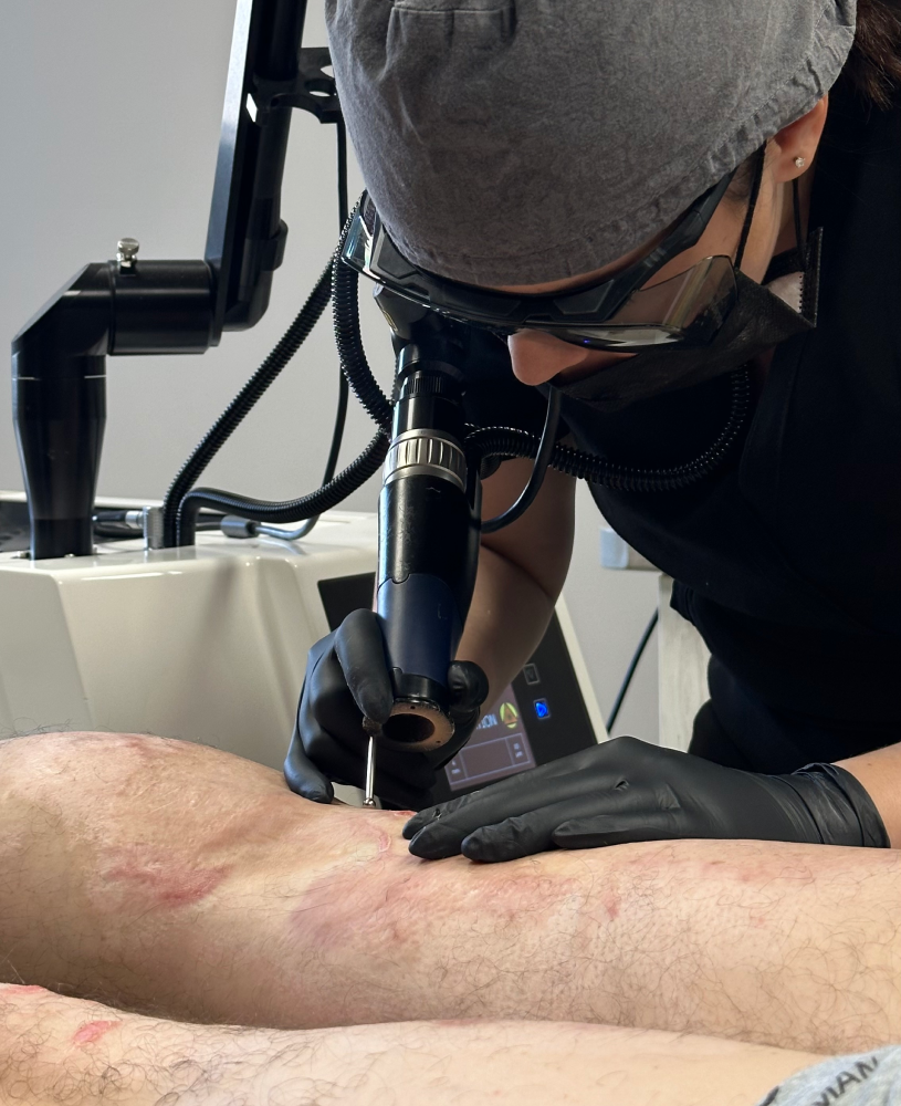 Якщо хочете подивитися, як це виглядає, забийте в інтернет «зведення тату». Тобто це спеціальним лазером проходяться по всім вашим шрамам. Неймовірно боляче. Це шліфування зрізає верхній шар епідермісу, і рубці стають м’якшими, еластичнішими, рухливішими. Вони все ще відчуваються, але вже геть не так, як раніше.