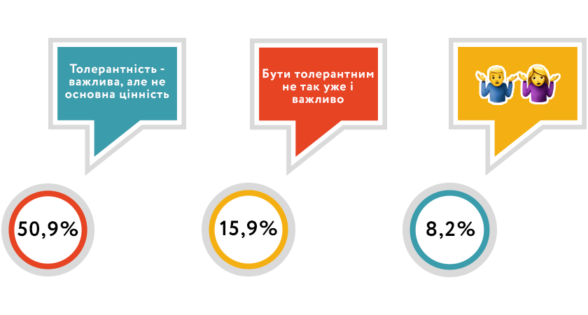 Згідно з національним соціологічним дослідженням «Що українці знають і думають про права людини», тільки чверть українців вважають толерантність найважливішою цінністю. Для половини опитаних (50,9%) це загалом важлива, але не основна цінність. Але є солідна частка населення (15,9%), яка переконана, що бути толерантним не так уже і важливо. Ще 8,2% було важко відповісти.