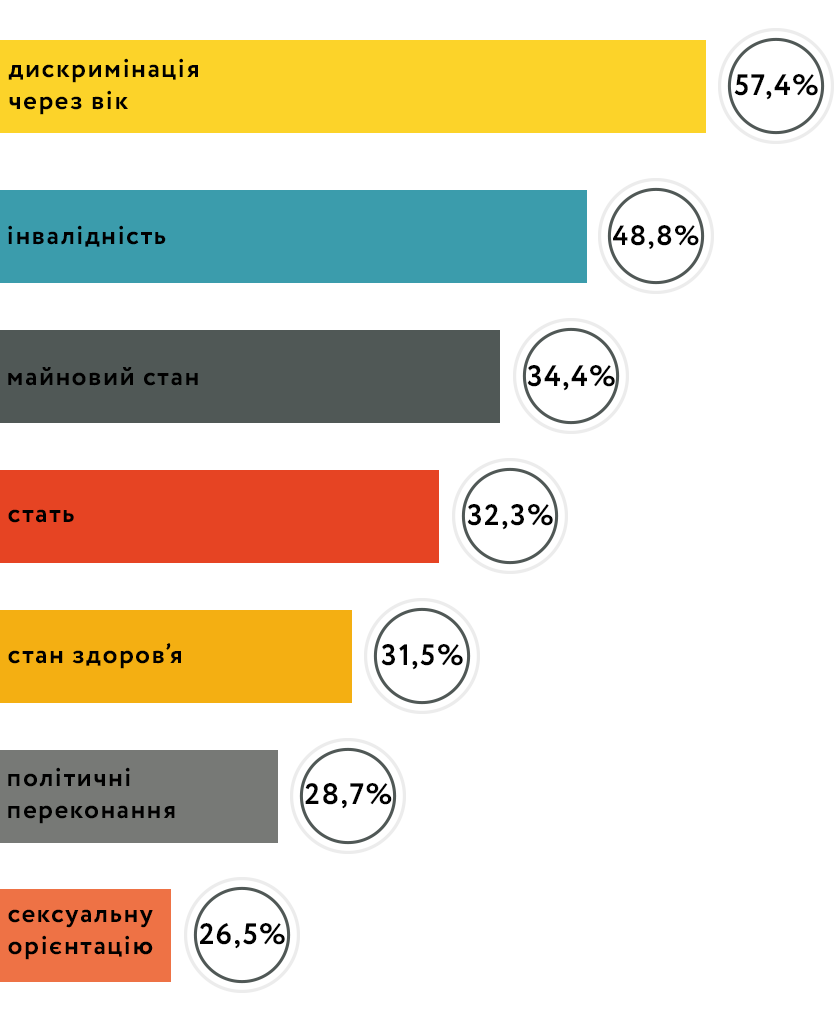 З тих українців, хто особисто зіштовхувався з випадками дискримінації, найчастіше це траплялося через вік – про це кажуть 57,4% респондентів. Майже кожний другий (48,8 %) дискримінувався через інвалідність, майже кожний третій – через майновий стан (34,4 %), стать (32,3%), стан здоров’я (31,5%), політичні переконання (28,7%), а також через сексуальну орієнтацію (26,5%).