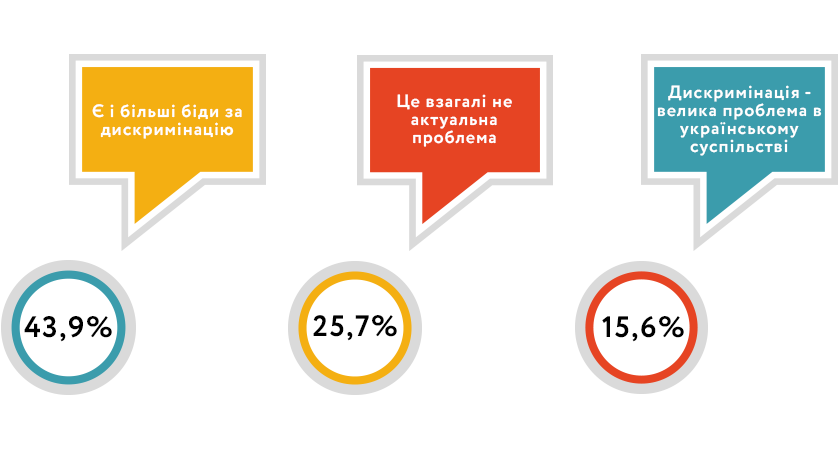 Як не прикро, в нашій державі дискримінація не вважається серйозною проблемою для більшості українців. Так, 43,9% опитаних переконані, що, хоч це загалом серйозно, але є і більші біди. Ще чверть респондентів (25,7%) кажуть, що це взагалі не актуально. І тільки 15,6% визнають дискримінацію як велику проблему в українському суспільстві.