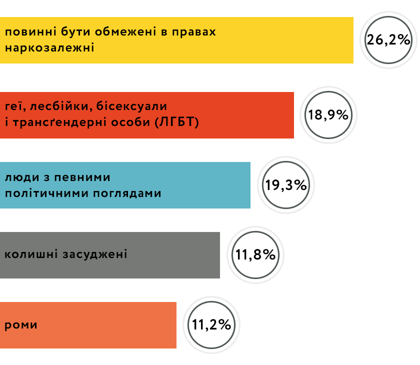 Так, згідно з даними дослідження, кожний четвертий українець (26,2% ) переконаний, що безумовно повинні бути обмежені в правах наркозалежні. 18,9% респондентів обов’язково обмежили б права геїв, лесбійок, бісексуалів і трансґендерних осіб (ЛГБТ). Ще 19,3% опитаних кажуть про обмеження для людей з певними політичними поглядами, а також колишніх засуджених (11,8%) та ромів (11,2%). У цьому «рейтингу» пощастило хіба що безробітним, переселенцям та безпритульним – зовсім незначний відсоток людей висловився за обмеження їхніх прав. Ситуацію погіршує той факт, що є велика частка українців, які вважають, що в принципі «ті люди» теж мають права, але за певних обставин вони можуть бути обмежені.