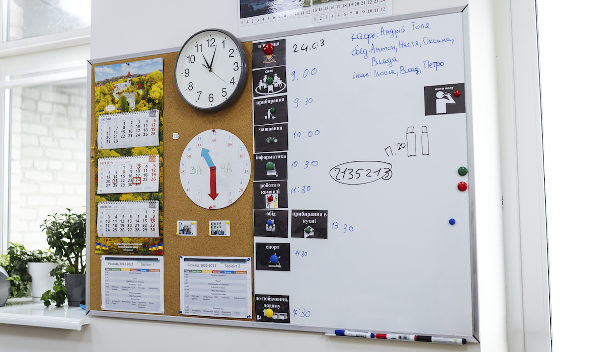 На стінах приміщення — різноманітна інформація. Наприклад, відлуння війни: два розклади занять — на випадки наявності й відсутності світла. Є вільний час на настільні ігри чи просто відпочинок, а серед предметів — українська мова, математика, практична діяльність, літературне читання, малювання. Наголос — на тому, що може бути корисним у житті.