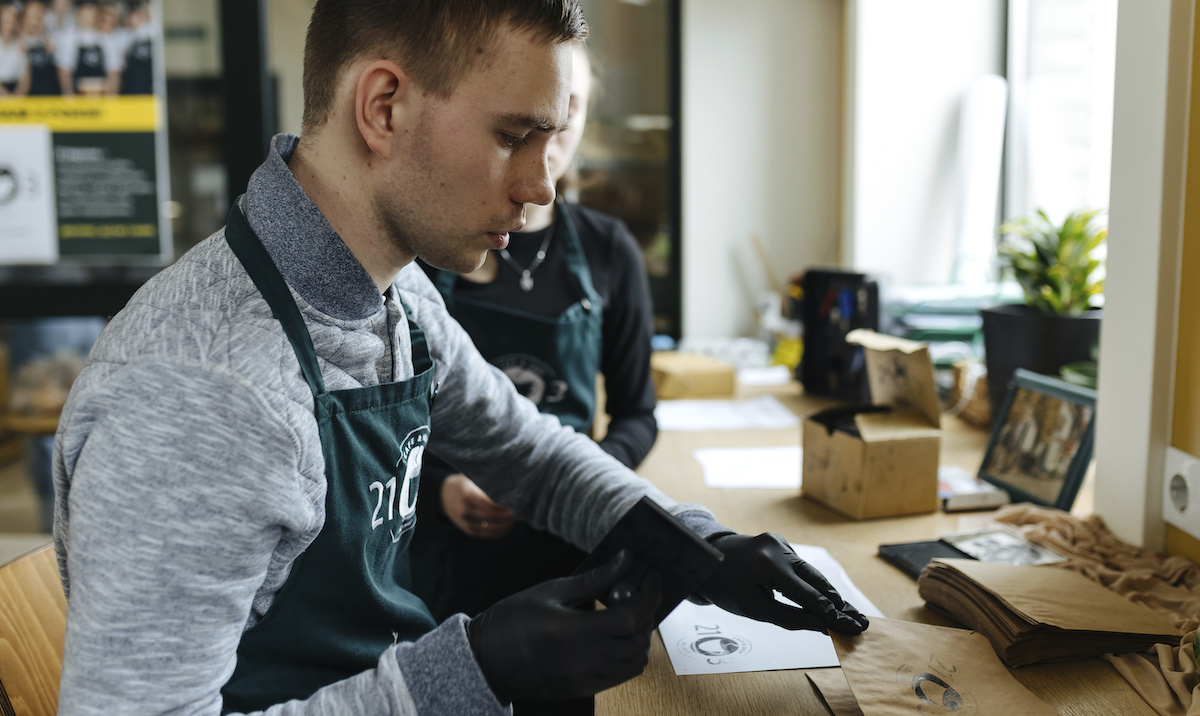 Вже за пару хвилин перед нею стоїть одноразовий стаканчик з напоєм. Бариста «пробиває» каву на планшеті, приймає оплату карткою і трохи нерозбірливо дякує. Його звати Толя, у нього порушення інтелектуального розвитку, і він — один зі студентів Перспективи 21.3 та практикант в броварському Кафе 21.3, що у 2021-му створила ця благодійна організація.