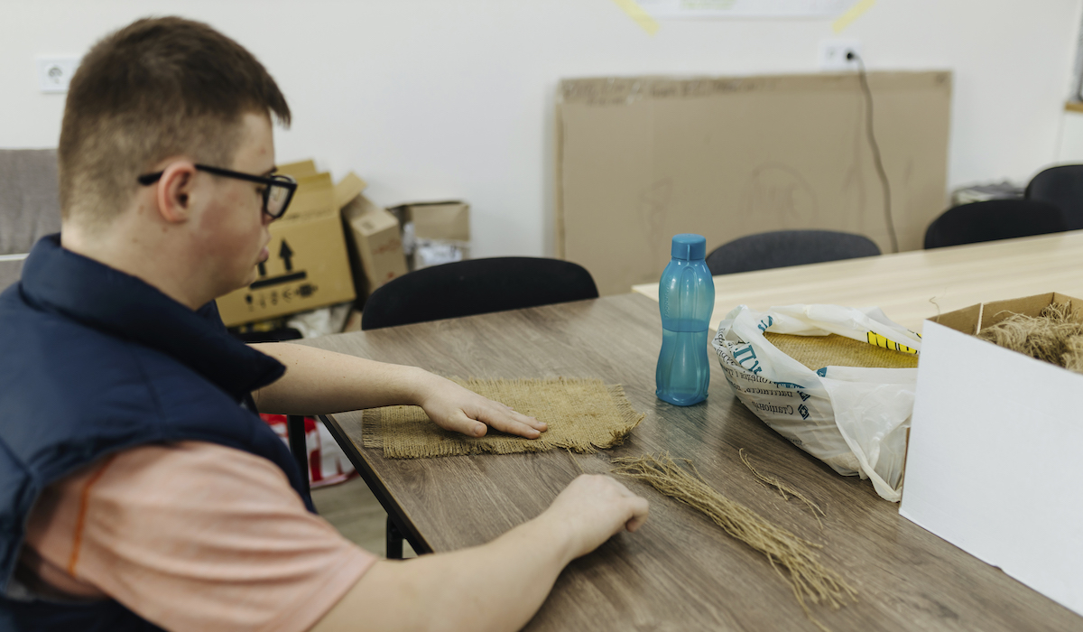 Тим часом Петро сідає окремо, дістає ящик зі шматками мішковини й починає ретельно розділяти тканину на окремі нитки. Це — ще одна ініціатива Перспективи 21.3. Після повномасштабного вторгнення вони разом зі студентами теж стали боротися за перемогу.