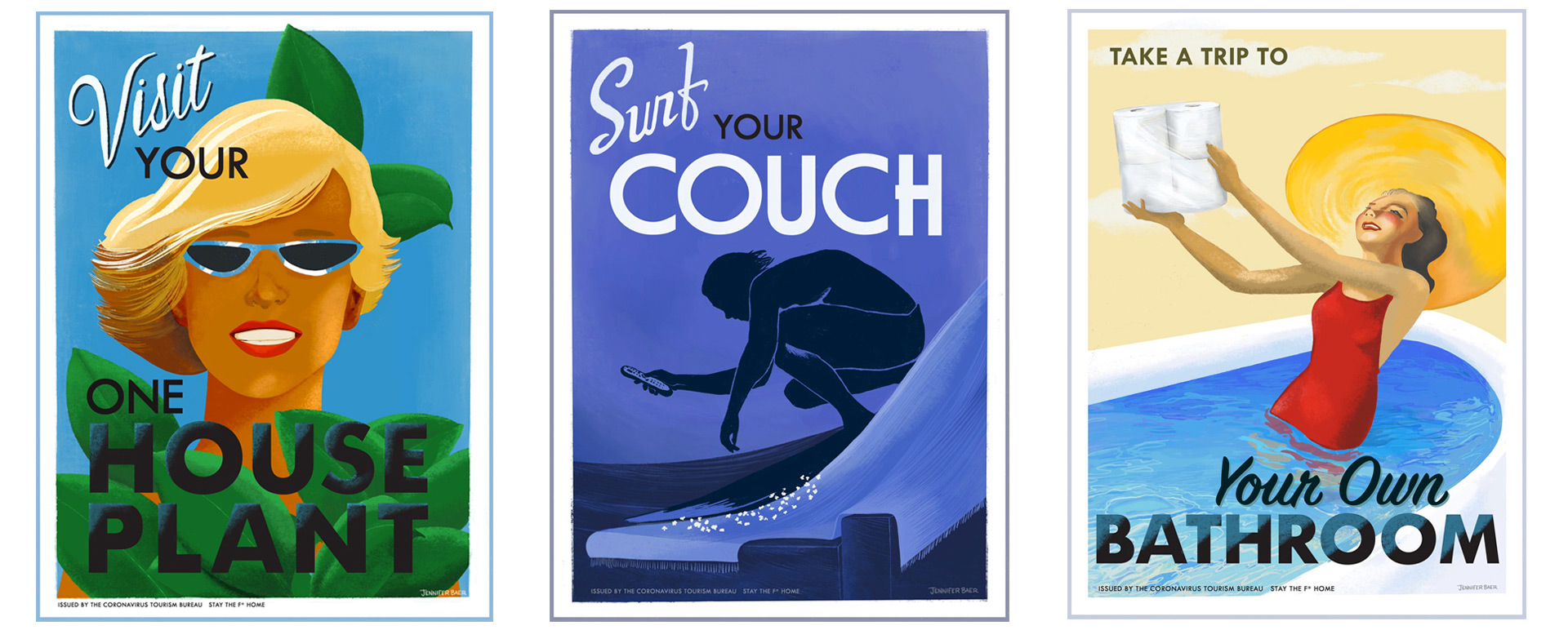 13. Дизайнерка Дженніфер Байєр із Каліфорнії створила серію актуальних рекламних плакатів під назвою «Коронавірусний туризм». Ними вона хоче сказати: «Агов, мандрівниче, залишайся вдома та качайся на хвилях диванних подушок!».