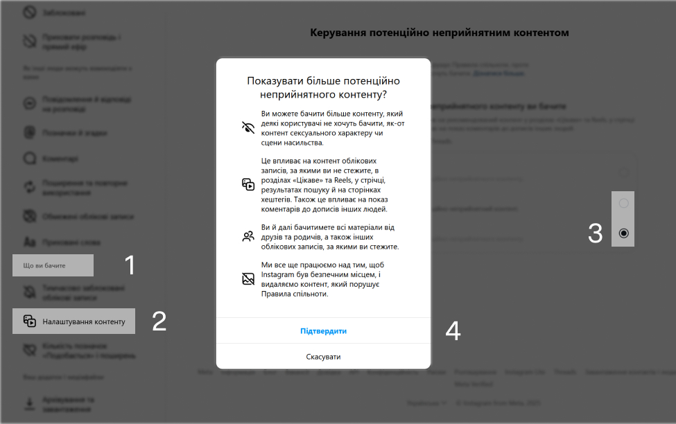 Щоб зняти це обмеження, необхідно зайти в налаштування Інстаграму, перейти до розділу «Що ви бачите» та обрати «Рекомендований контент» — тобто від облікових записів, за якими ви не стежите. Там ви й побачите обмеження у видимості політичного контенту. Коли ви знімете це обмеження, вам із більшою ймовірністю рекомендуватимуть контент на політичні та соціальні теми. Тож пишіть своїм знайомим іноземцям, які про це обмеження ще можуть не знати, і допоможіть його зняти — це також допоможе просувати дописи про війну в Україні.