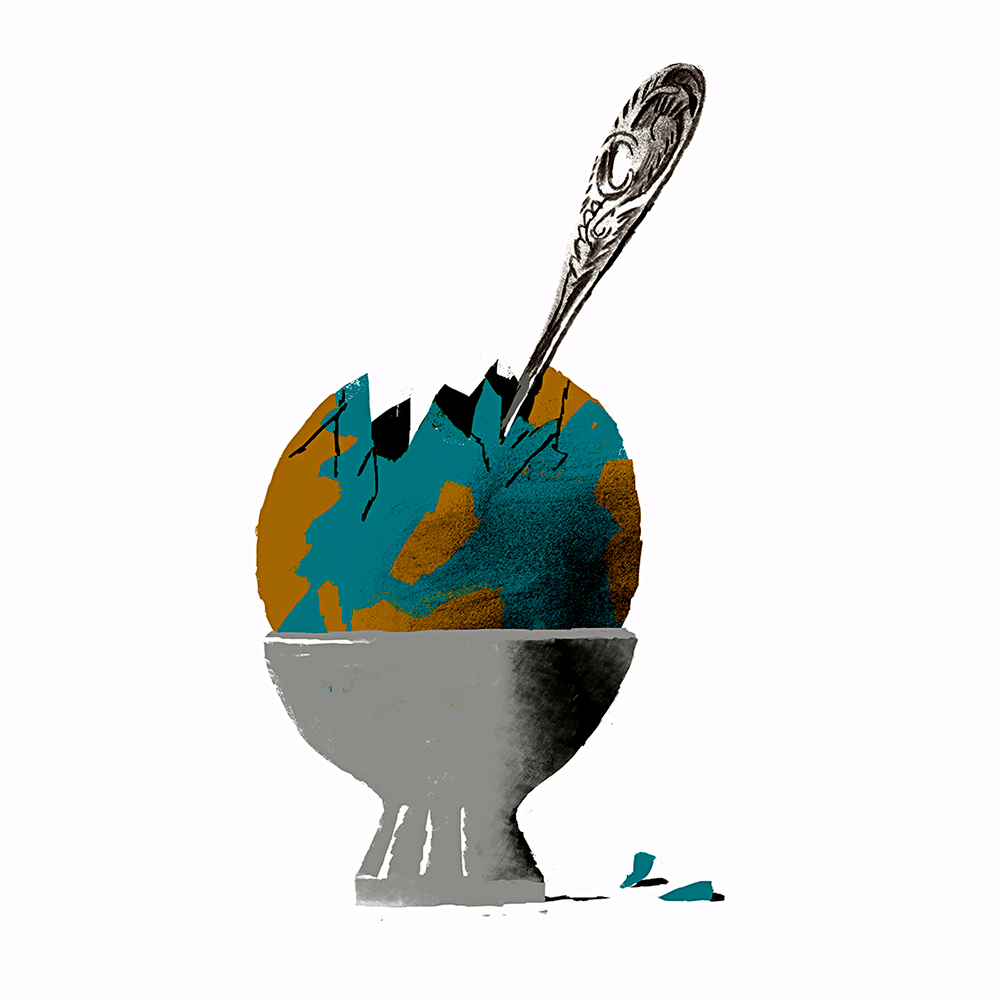 Ну, наприклад, на День Землі хотів робити картинку. Я думав – так, що в цьому є? Наприклад, я фокусуюсь на тому, що людина споживає, вона знищує землю, тож я пишу собі синоніми знищення. Спалює, скопує лопатою, з’їдає… Ага, з’їдає – це цікаво. Що є кругле, що можна з’їсти? Приходжу до того, що це може бути шкаралупа яйця розтріскана, тобто Земна куля з материками, в ній ложечка і вона в підставці для яйця. От такий хід думок приблизно, коли ти чіпляєшся за слова і візуалізуєш.