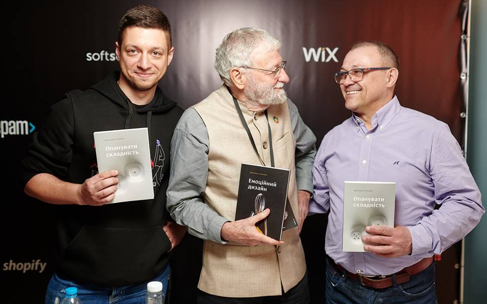 Олександр Тригуб, Дон Норман і директор видавництва Art Huss Костянтин Кожемяка з книжками, які вони разом видали.