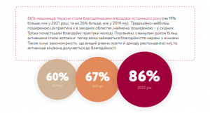 Також значно зросла залученість українців до благодійності. 86% мешканців України стали благодійниками впродовж останнього року. Люди бачать гостру потребу в допомозі і готові її надати. Наприклад, середній благодійний внесок у 2022 виріс у 9 разів, порівняно з минулим роком. Також зросла кількість волонтерів. Якщо у 2021 році це 5%, то зараз це третина українців.