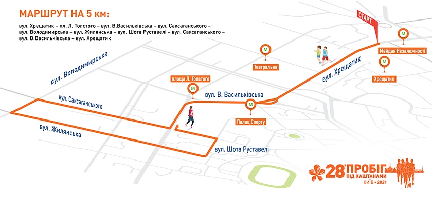 Для учасників Спортивного та Благодійного Пробігу організатори пропонують подолати дистанція 5 км за таким маршрутом: вул. Хрещатик — пл. Л. Толстого — вул. В.Васильківська — вул. Саксаганського — вул. Володимирська — вул. Жилянська — вул. Шота Руставелі — вул. Саксаганського — вул. В.Васильківська — вул. Хрещатик.