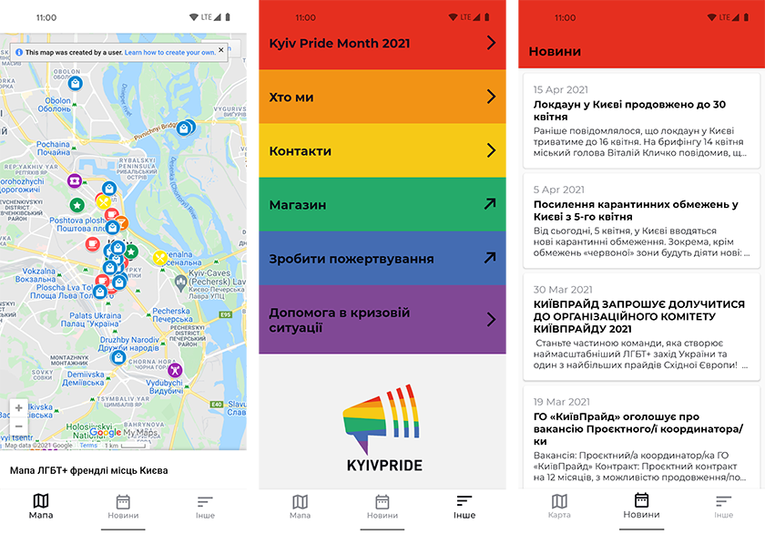 Громадська організація «КиївПрайд» запустила мобільний додаток для ЛГБТ+ спільноти під назвою KyivPride зі зручною картою френдлі закладів, актуальними новинами про ГО та важливими контактами для допомоги ЛГБТ+ людям. А до ПрайдМісяця2021 там з’явиться програма заходів.