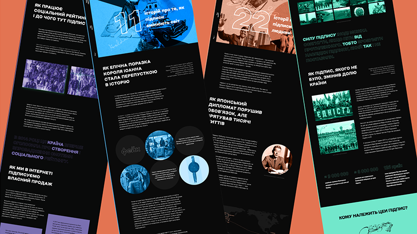 Тож компанія створила сайт «Сила підпису». Він працює за принципами скролітелінгу, коли перегляд перетворюється на справжню мандрівку, безперервну історію, що не відпускає до останньої сторінки. Історичні ілюстрації, аудіозаписи та інтерактивні тести допоможуть читачу сайту запам’ятати кожну розповідь про доленосні рішення, засвідчені підписом на глиняній табличці, пергаменті або папері.